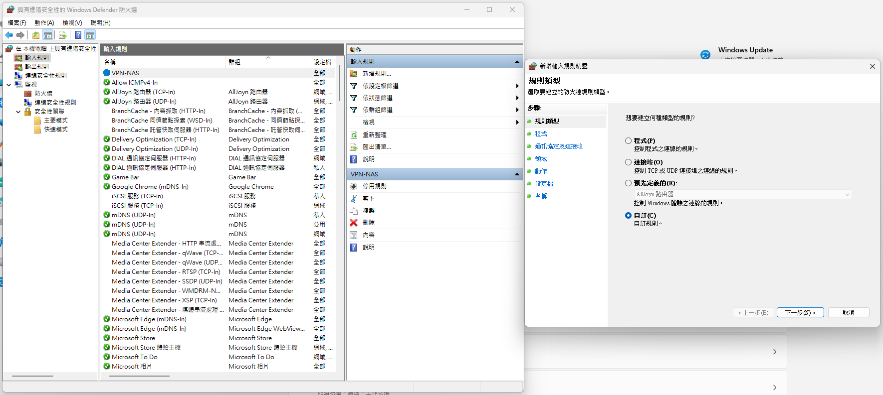 輸入規則 -> 新增規則 -> 自訂 -> 所有程式 -> 任一
